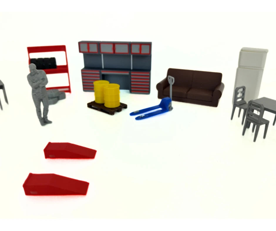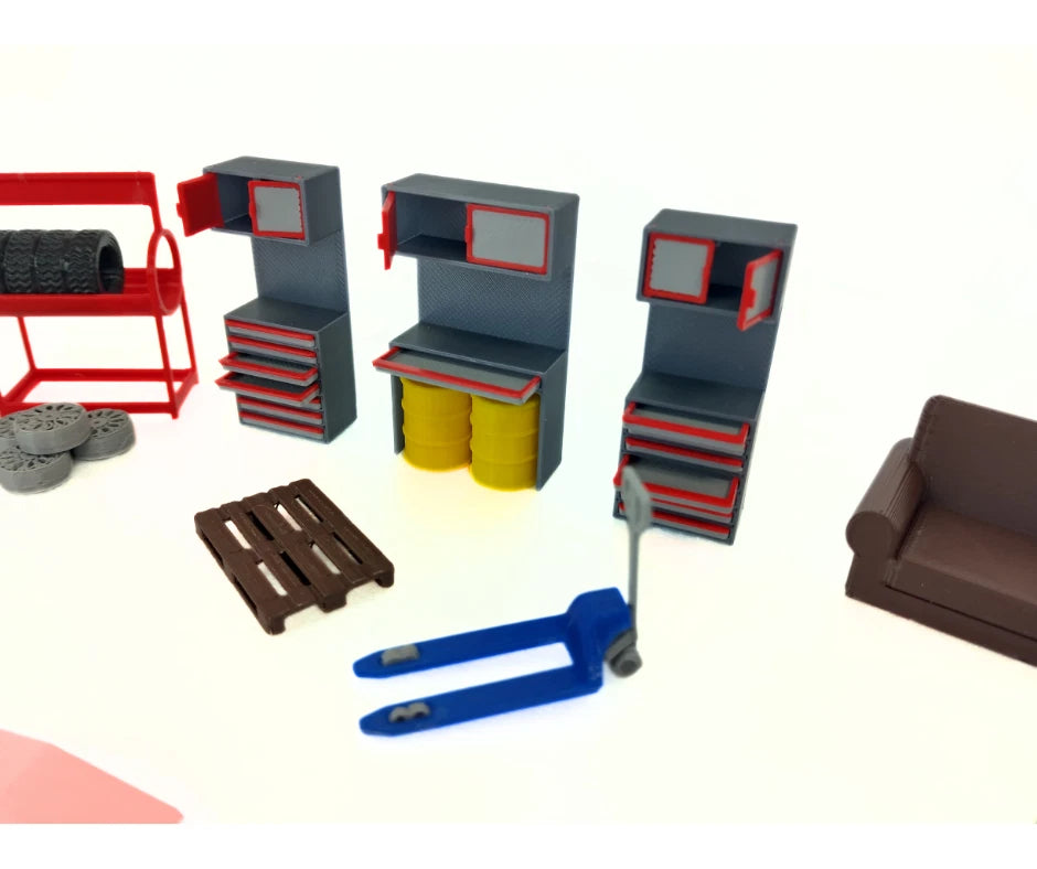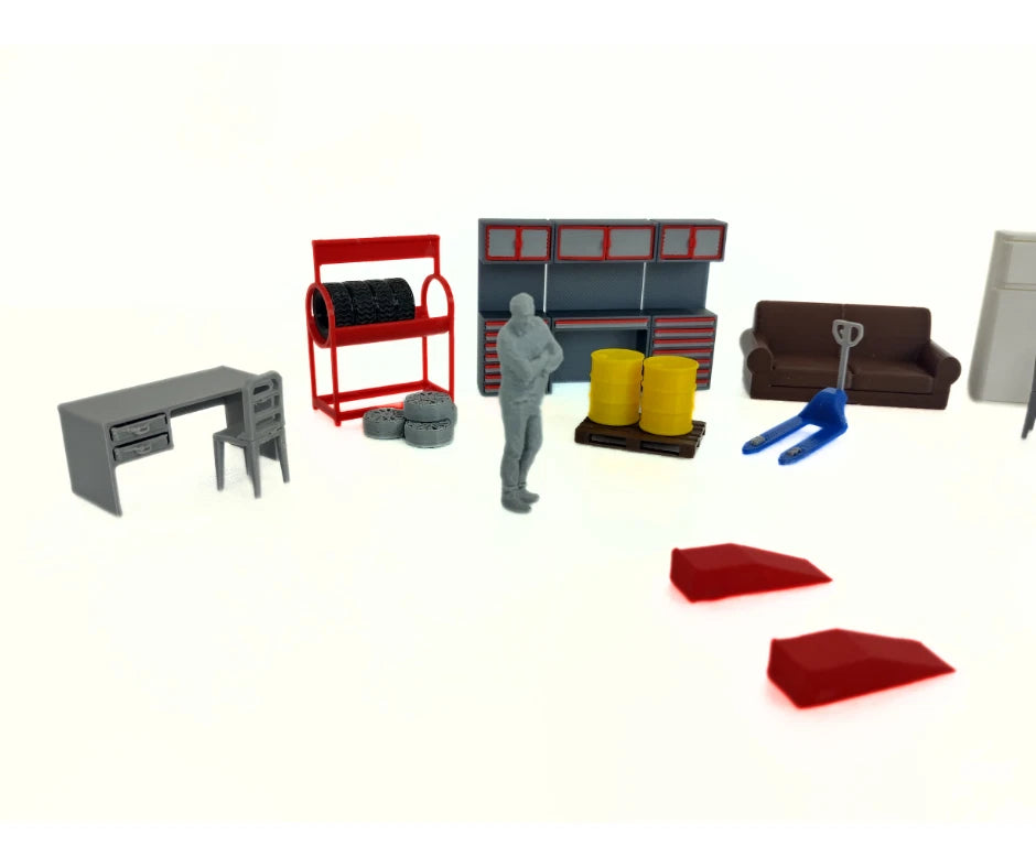 Добавете реализъм към вашата 1:43 диорама с професионалния комплект авто сервиз оборудване. Включва шкафове, работни маси, палети, гуми, мебели, фигура механик и още. Идеален за колекционери, фотографи и моделиращи сцени. Висококачествена изработка, бърза доставка с проследяване и комбинирана доставка.