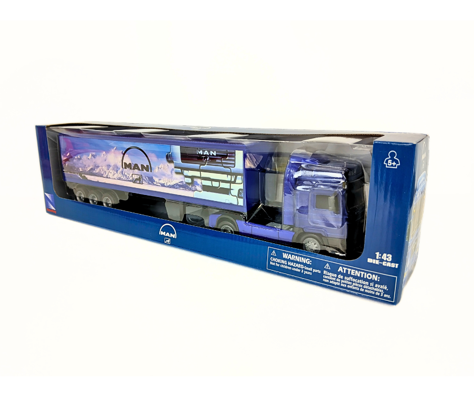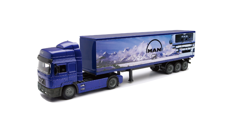 Изработен от метал и висококачествена пластмаса, камионът е идеален както за игра, така и за добавяне към колекционерска витрина. Моделът включва контейнер с възможност за отделяне от ремаркето и внимателно оформени детайли на кабината MAN F2000.
