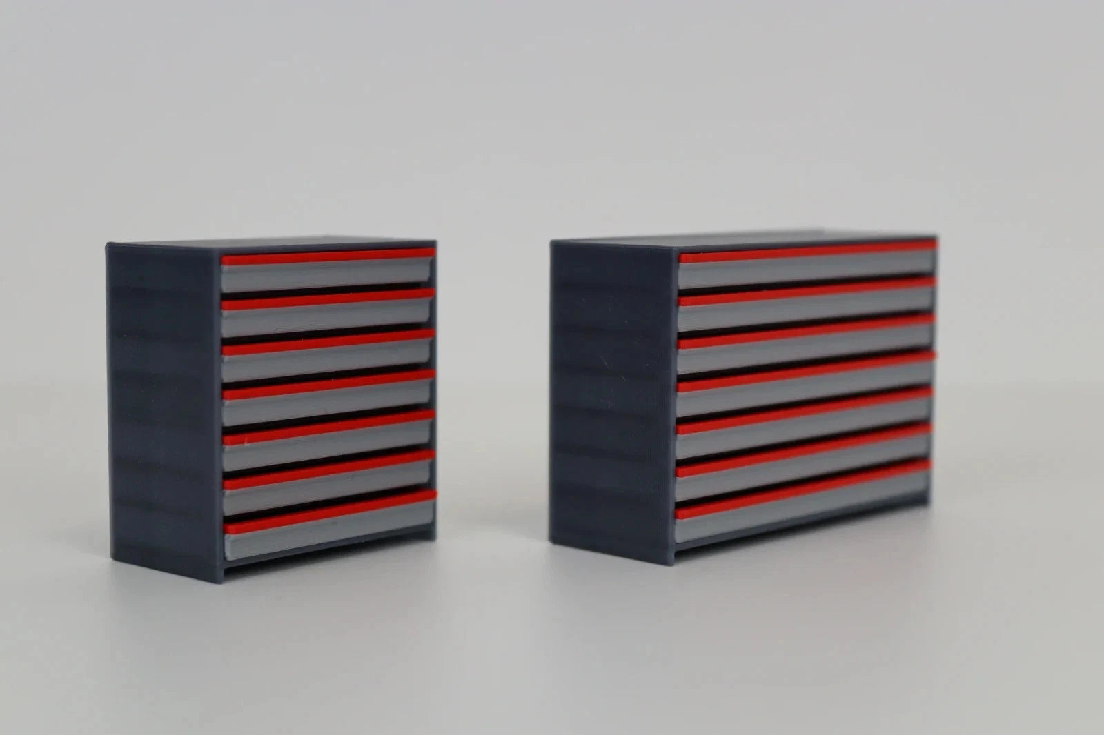 Добавете реализъм към вашата 1:18 диорама или гаражна сцена с този комплект мини шкафове за инструменти.